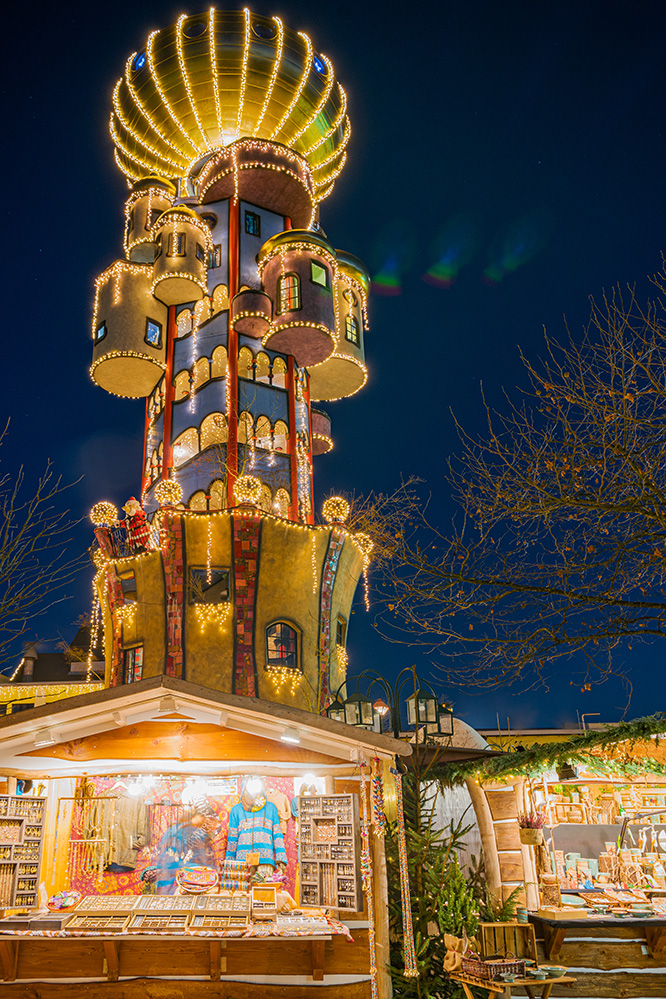 Mal nannte er sich Regentag, dann signierte er seine Werke als Dunkelbunt. Auch Friedensreich Hundertwasser war nicht sein wahrer Name. Der bürgerliche Friedrich Stowasser (1928-2000) bediente sich einerseits am Japanischen – wo sein Vorname aus den Zeichen für „Friede“ und „reich“ gebildet wird – und übersetzte das „sto“, wie es in den slawischen Sprachen vorkommt, zu „hundert“. So wandelbar sein Verständnis vom eigenen Ich war, so einzigartig zeigt sich dieser Charakter auch in seiner Kunst. Und die kommt in einem Gebäude zur Geltung, dessen Umrisse jetzt mit Lichterketten geschmückt die Nacht erleuchten: im KunstHausAbensberg.