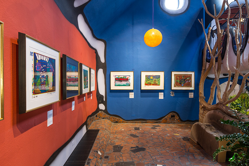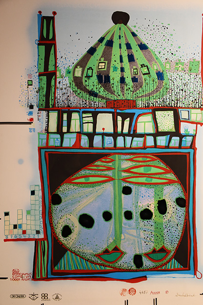 Die Kunst von Hundertwasser sollte für jeden erschwinglich sein. Und trotz der Vielzahl an Werken einzigartig bleiben. So kam es vor, dass Hundertwasser für 10.001 Stück einer Grafik-Serie wochenlang nur mit der Signatur und Nummerierung beschäftigt war. Lila, pink, schwarz, blau: Jedes Kunstwerk unterscheidet sich allein in der Komposition der Farben. Manche von ihnen leuchten sogar im Dunkeln. Und der Betrachter meint, stets von mehreren Augenpaaren angeschaut zu werden. Spiralförmige Linien wirbeln durch die Bilder, alles fließt. Eingestreute Kristalle, Glasstaub und Metallfolie funkeln und erzeugen einen 3D-Effekt.