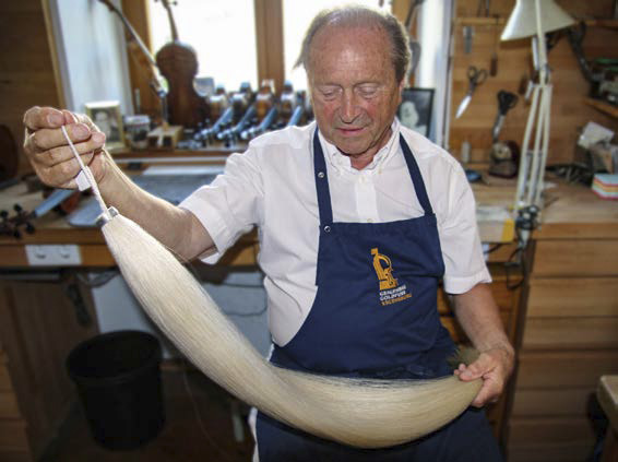 Horst Goldfuss prüft das Haar für einen Geigenbogen. Etwa 170 Haare aus dem Schweif eines Pferdes braucht es. Diese müssen gleichmäßig dick sein und eine gesunde Oberflächenstruktur aufweisen. © Manuela Drossard-Peter