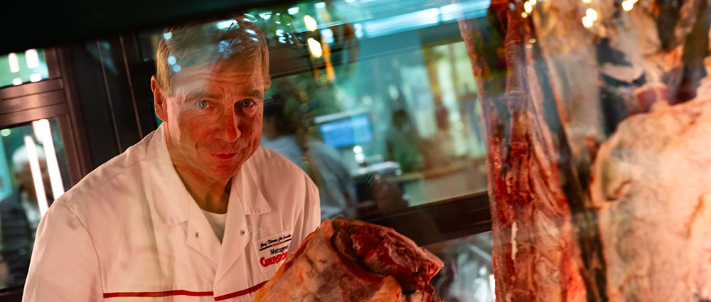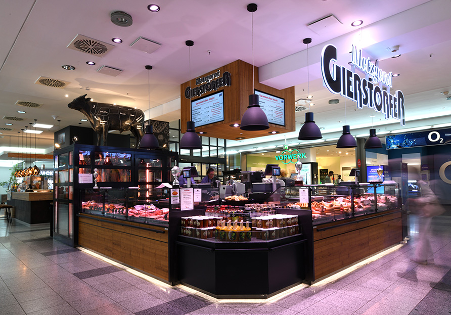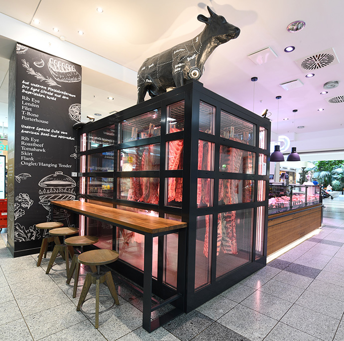 Im begehbaren “Fleisch-Humidor” der Filiale im Donau Einkaufzentrum reifen die dry-aged Steaks von besten Rindern aus dem Bayerischen Wald. Mindestens drei Wochen lagern sie hier bei einer Temperatur von 1 Grad Celsius und optimal eingestellter Luftfeuchte. Zusätzlich gibt es zart marmorierte Rib Eye-, Lenden- und Flank Steaks vom Angusrind aus Omaha (Nebraska, USA), welche durch die spezielle Kombination aus Weidehaltung und Maisfütterung ihr unverwechselbares Aroma erhalten.
