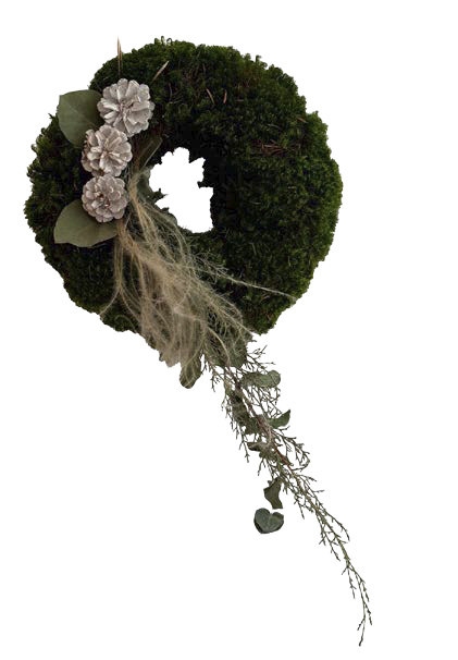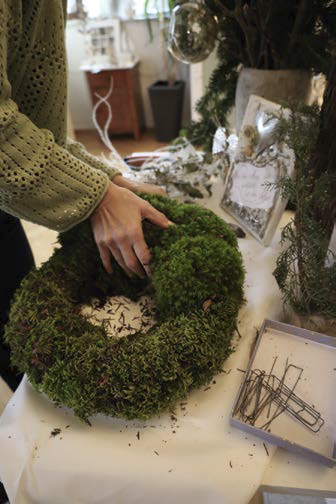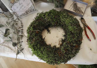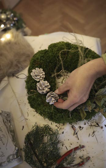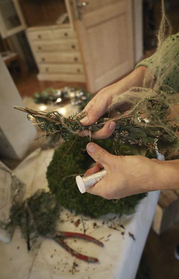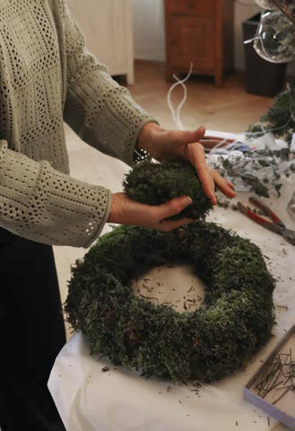 Mit Draht befestigt Sandra Schwarz Moos flächig auf einem Strohkranz, arbeitet auf der Rückseite einen Aufhänger aus. Sie steckt rundum dickes Polstermoos mit Krampen fest und setzt seitlich einen Schwerpunkt mit drei weiß gewachsten Kiefernzapfen. Ein schlankes Bündel von Wacholder, Eukalyptus, Mönchspfeffer und Federgras schafft Spannung. Schlicht und effektvoll.