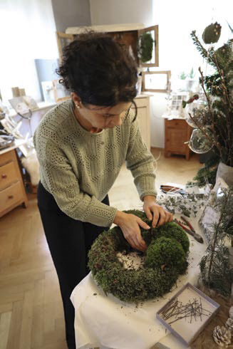 Während die 51-Jährige in ihrem Showroom sorgsam Moospolster kugelig formt und steckt, erklärt sie: „Ich arbeite in Schichten, auf die Basis kommt Fülle – mal fein, mal üppig, mal einseitig. Dann folgen Schwerpunkte wie Zapfen – drei auffällige, vier kleinere – und dann Details.“ Rustikale Jute, die Farbe Schwarz, Hauswurzen – der überraschende Twist bereitet Sandra Schwarz am meisten Freude. „Diese Vielfalt innerhalb eines Stückes macht den Zauber aus“, sagt sie und lacht.