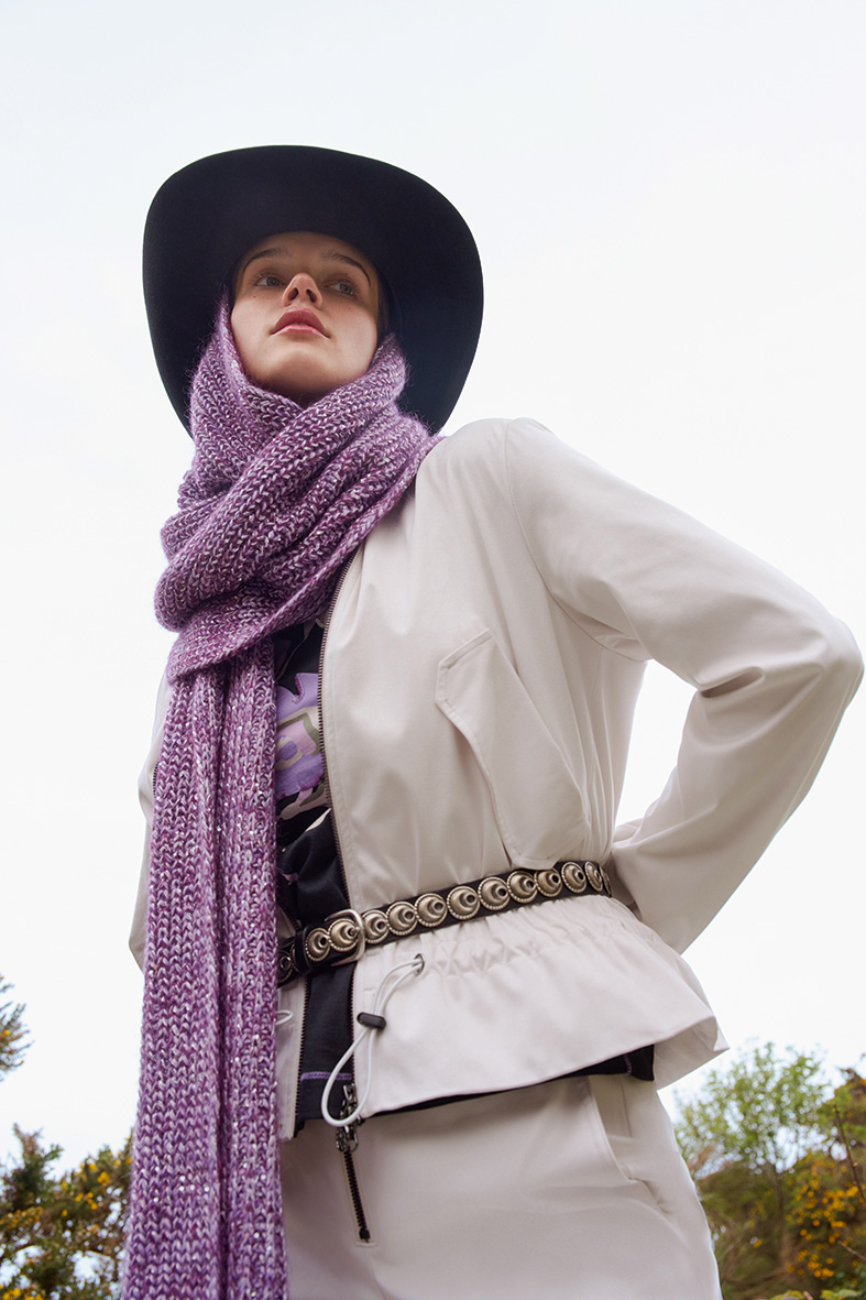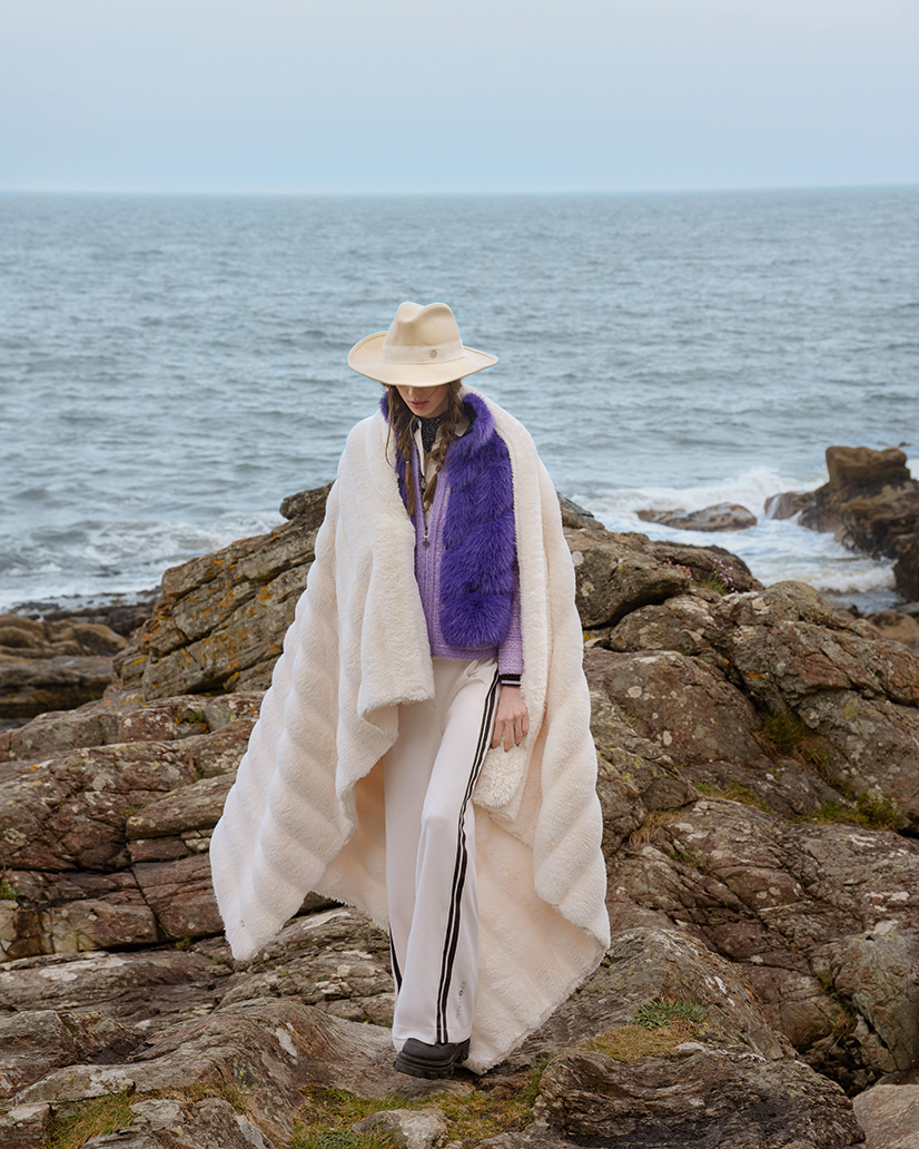 Mit „Flowy Luxury“ legt Frau auch an kühlen Tagen einen coolen und dennoch stilsicheren Auftritt hin: fließende Linien, üppige Lässigkeit. Für die moderne Neuinterpretation des Hosenanzugs wurde veganes Velour gewählt und mit Hut, Schal und Gürtel kombiniert. Die Entwürfe zeigen kühles Weiß, Lila und Schwarz mit Fake-Fur und Wolle.