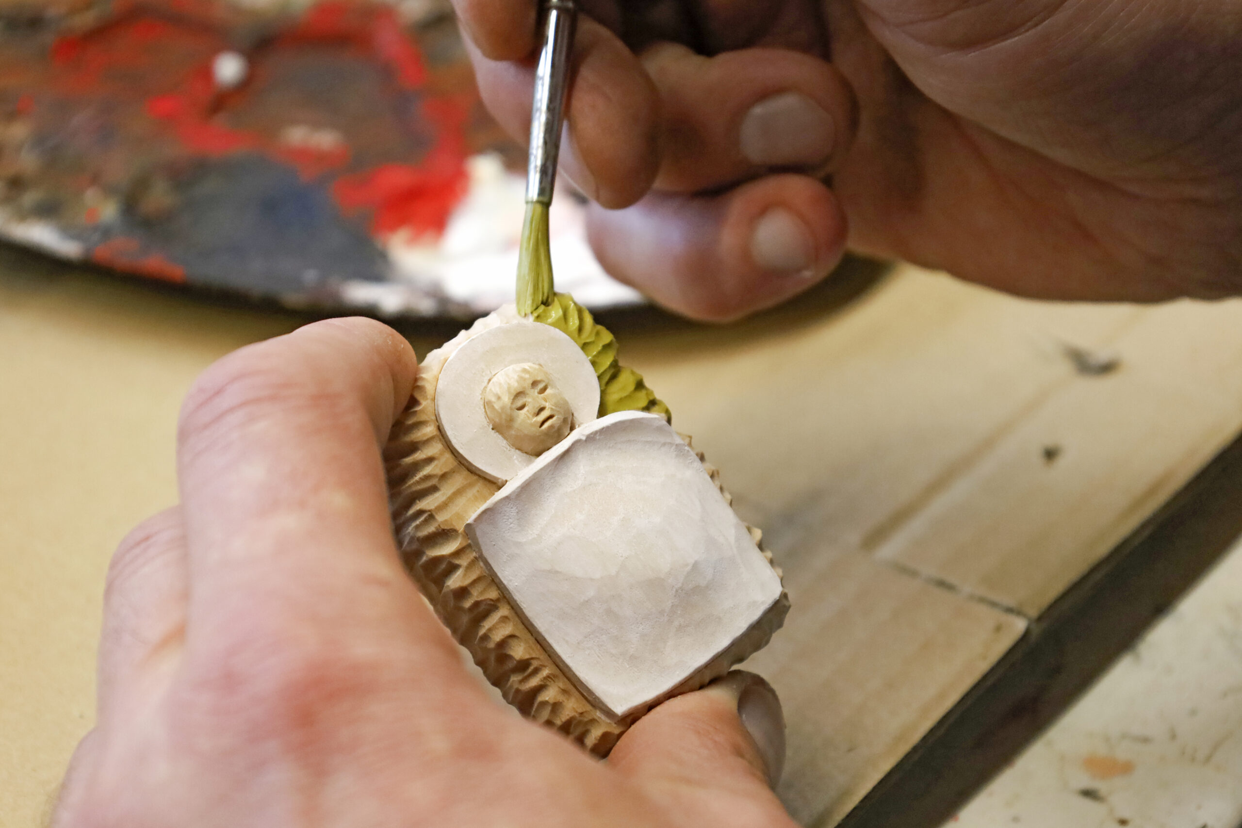 Geduld ist auch gefragt, als der Herrgottschnitzer in seiner Werkstatt einen kleinen Jesusknaben in der Krippe zur Hand nimmt. Zuvor hat er aus einem Holzstück die Kontur der späteren Figur ausgesägt. Schnitzeisen in verschiedenen Breiten verleihen die gewünschte Form. Gut sichtbar erhebt sich eine Decke über dem geriffelten Bett aus Stroh, samt Heiligenschein. Nun trägt von Zülow eine Lasur auf, greift zu seiner Farbpalette und mischt einen hellen Grünton zusammen. Dicke Borsten gleiten um die Figur, bis die Pinselstriche filigraner werden. Fein schattierte Pausbacken, Haaransätze und Pupillen zieren das wenige Millimeter große Gesicht. Farbloses Bienenwachs schützt das Ganze. Ein neuer Jesus ist geboren.
