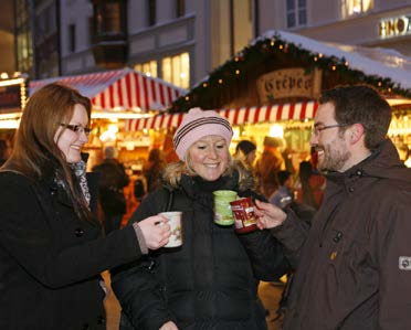 Das Flair, das der Regensburger Christkindlmarkt unweit des Domes versprüht, ist einzigartig. 69 rot-weiß bedachte Buden und drei festlich geschmückte große Christbäume reihen sich wie eine Kette rund um die evangelische Neupfarrkirche. Dabei hat sich der Markt die Vielfalt des Angebots in seiner über 200 Jahre alten Tradition bewahrt. Modernen Plunder gibt es nicht. Dafür aber edles Kunsthandwerk aus Glas, Keramik oder Holz sowie bunte, handgeblasene Christbaumkugeln – etwas das heutzutage nicht mehr oft auf Weihnachtsmärkten anzutreffen ist. Dazu kommen hochwertiger Schmuck, Fair-Trade-Geschenke aus Indien und Nepal, weihnachtlicher Blumenschmuck, warme Mützen, Taschen und vieles mehr, das sich auch als stilvolles Geschenk unter dem Weihnachtsbaum eignet. Vor allem bei Kindern besonders beliebt sind der Glasbläser, bei dem man sich etwa ein Foto des eigenen Haustiers in ein Trinkglas bannen lassen kann, und die bunte Farbenvielfalt am Edelsteinstand. Neben Schmuck und Deko gibt es hier Drusen, mit Kristallen besetzte Gesteinshohlräume, etwa aus Marokko oder Brasilien. Ist der Stein leicht, wird die Hohlkammer im Inneren groß sein. Gespannt erwarten Kinder das Ergebnis, wenn der ausgewählte Stein vor ihren Augen in zwei Teile geschnitten wird. In der „Krippenklinik“ repariert eine Bildhauerin Ochs und Esel gegen eine Spende.